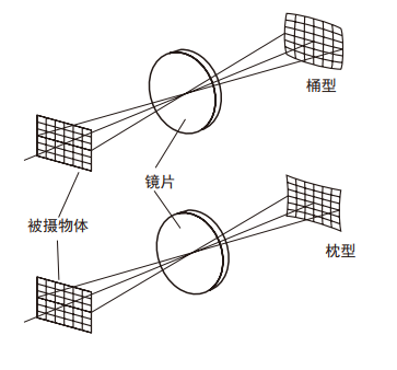 被攝物體經過鏡頭拍攝后在成像面上變成彎曲的現象。畸變分為桶型畸變和枕型畸變。